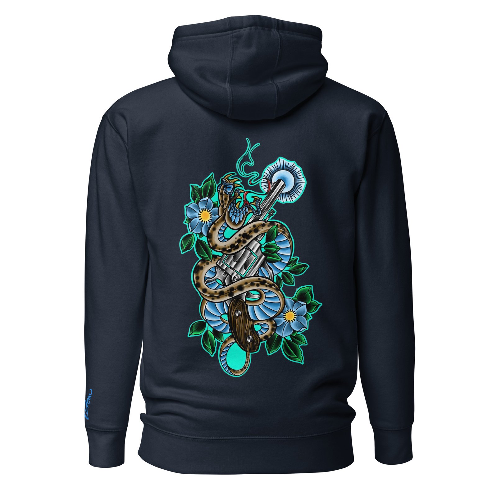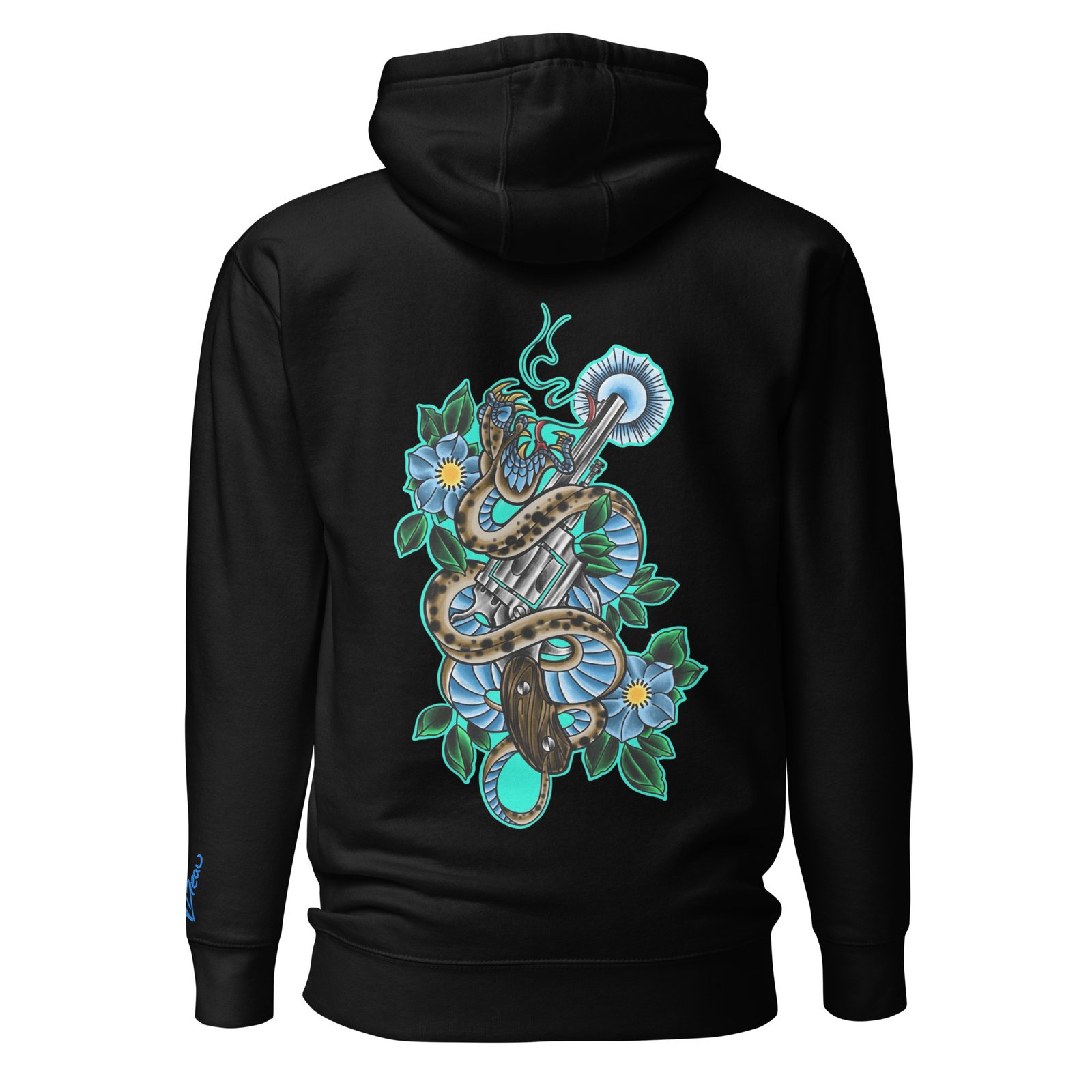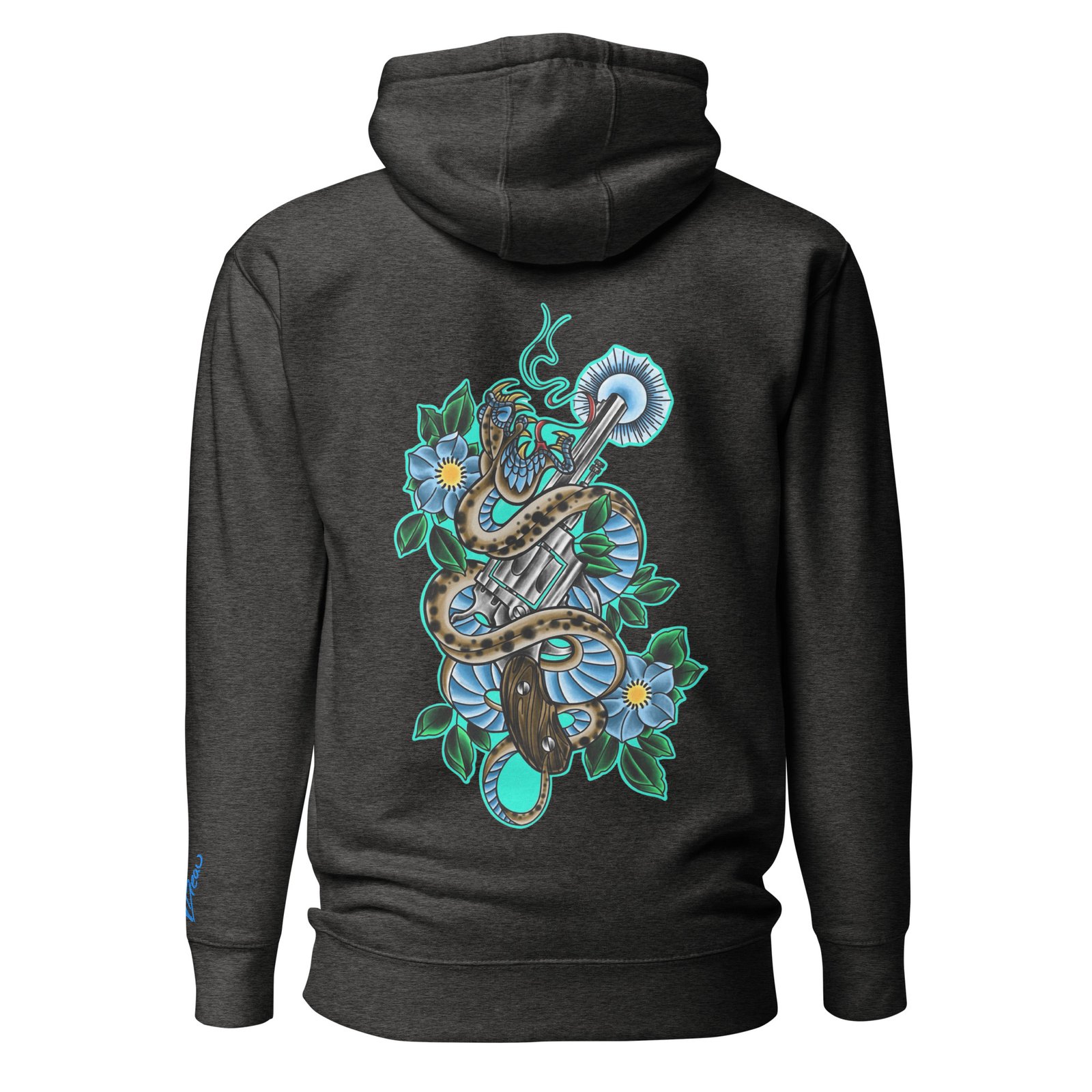 Ready to slay? Think high-quality cotton with a comfort-fitted hood, matching drawstrings, and a front pocket with a rocking art piece by Jason Breau of Ardent Ink Tattoo Studio Upgrade your look with this dope premium hoodie.