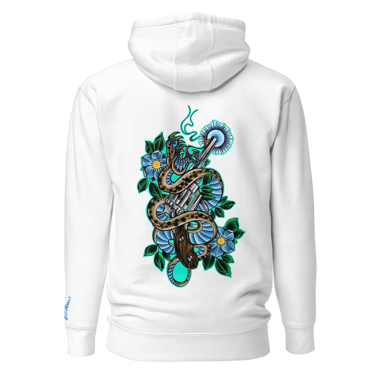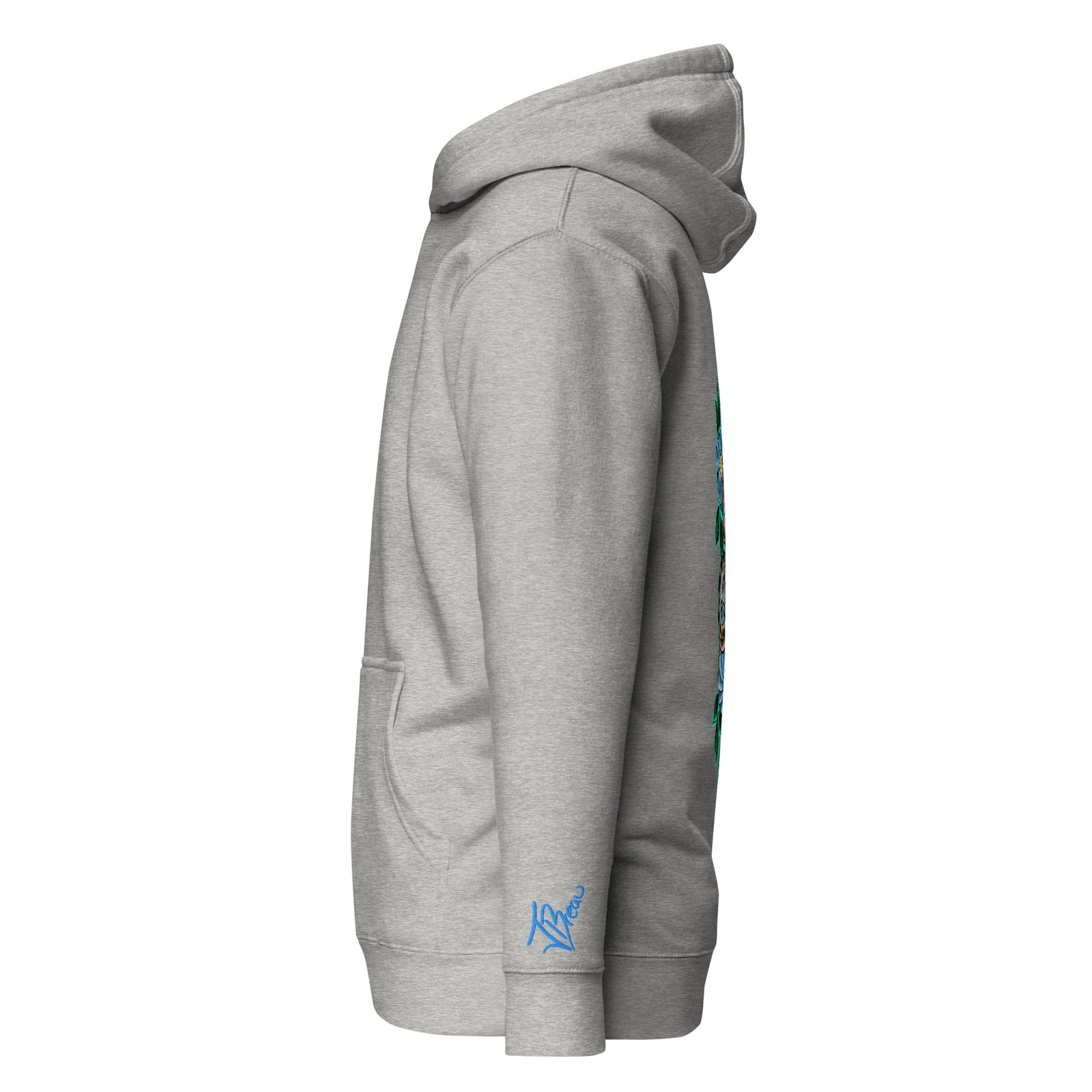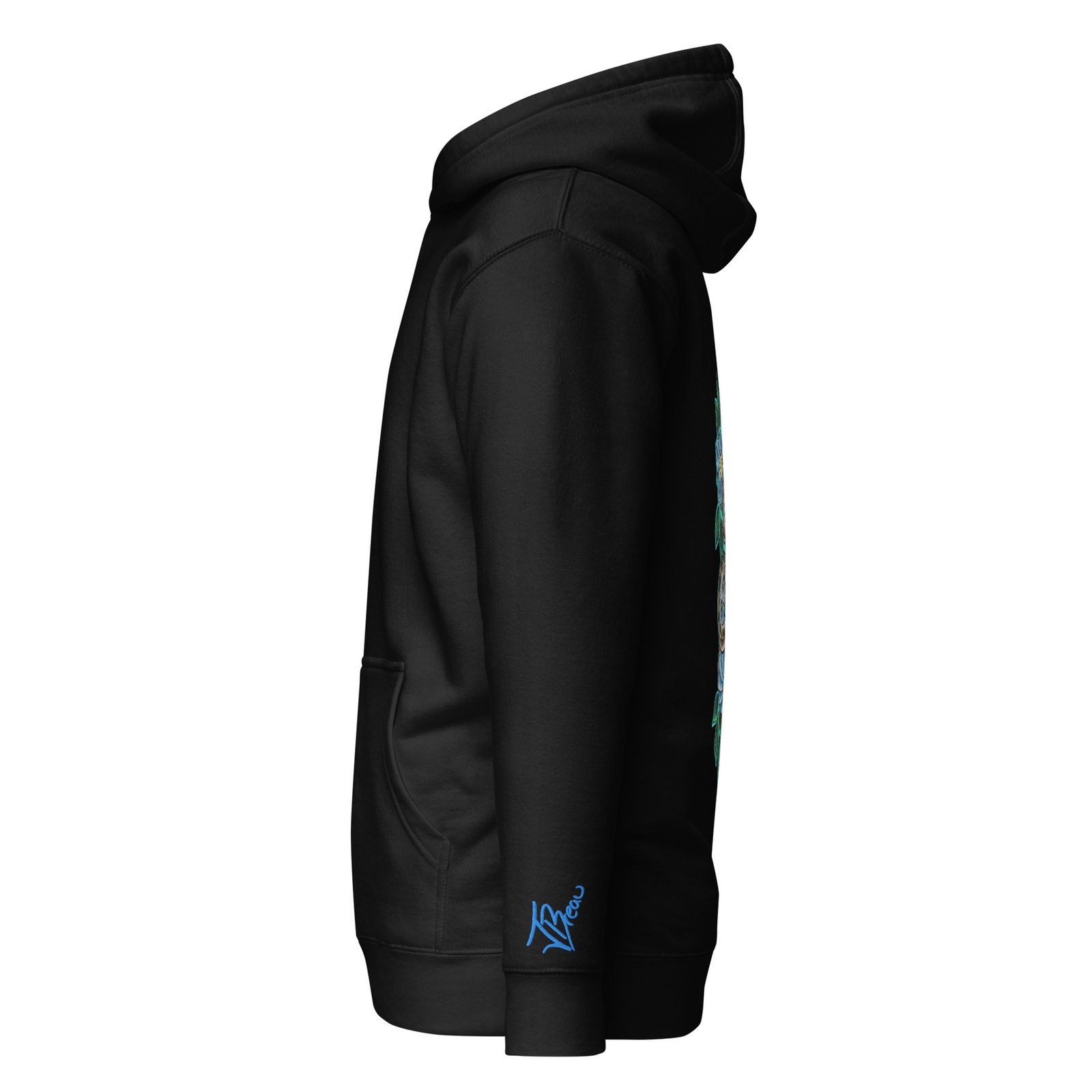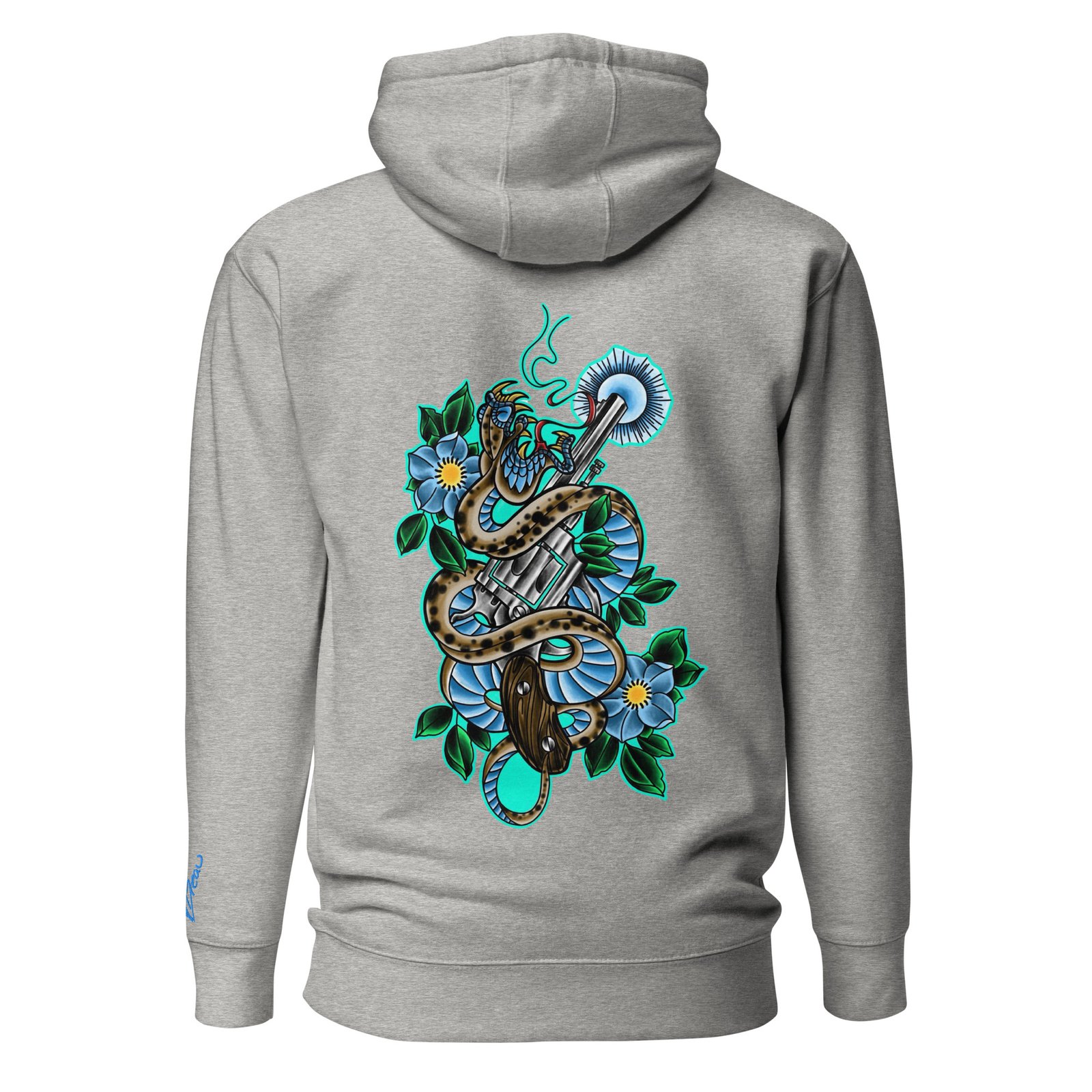 Ready to slay? Think high-quality cotton with a comfort-fitted hood, matching drawstrings, and a front pocket with a rocking art piece by Jason Breau of Ardent Ink Tattoo Studio Upgrade your look with this dope premium hoodie.