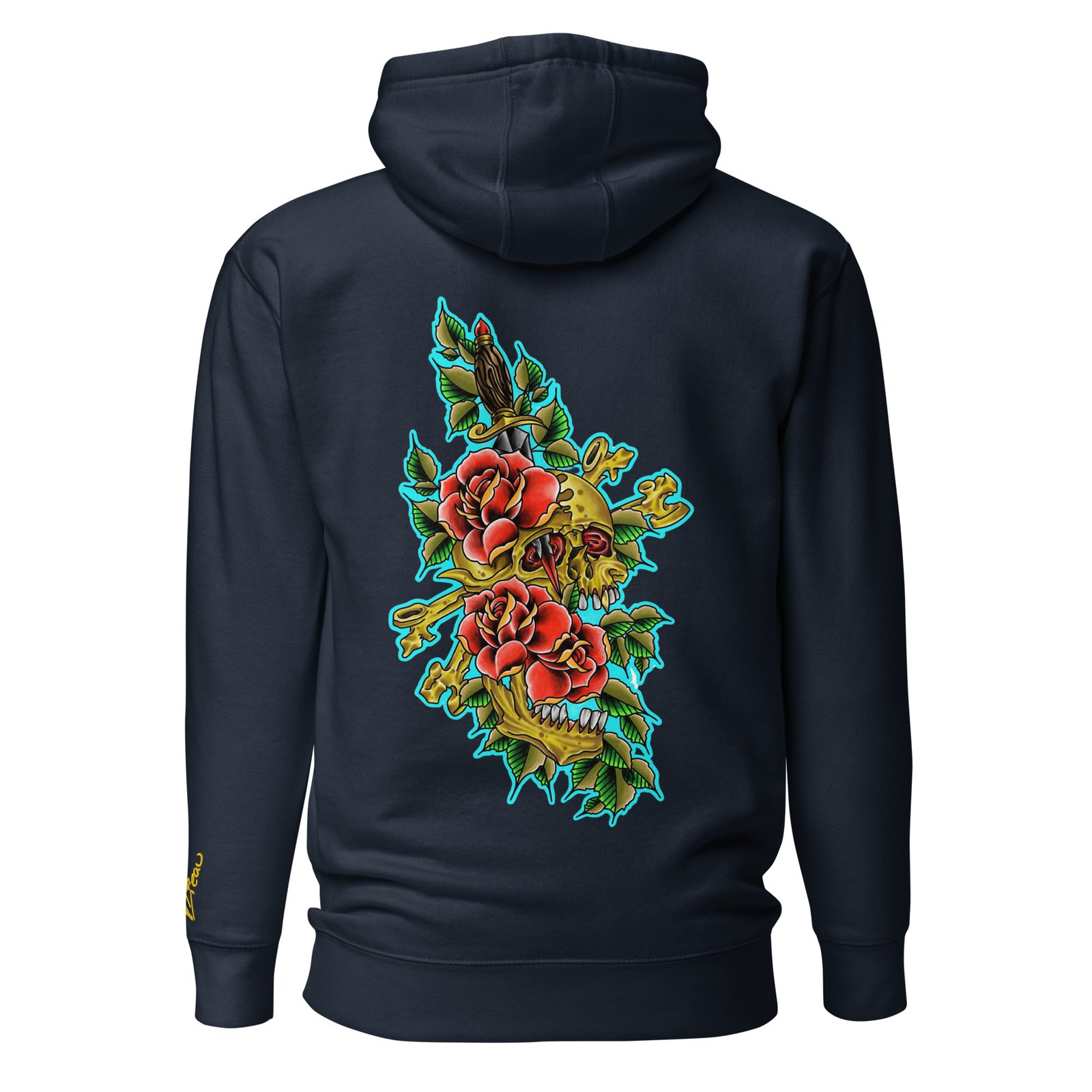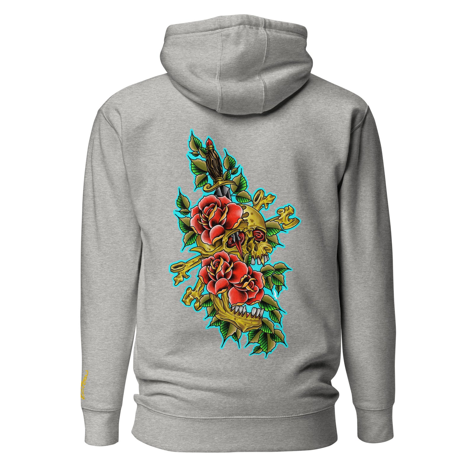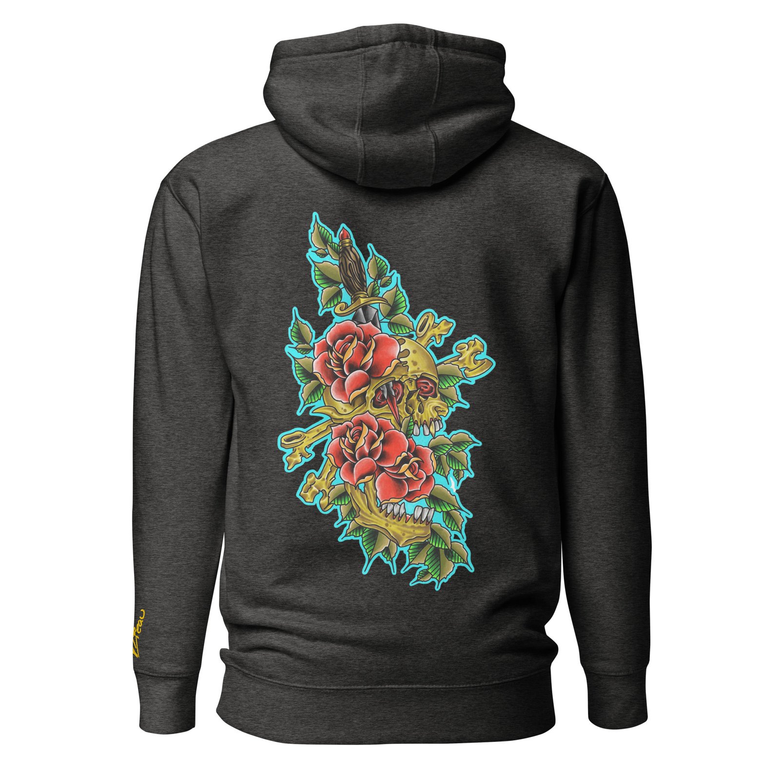 Ready to slay? Think high-quality cotton with a comfort-fitted hood, matching drawstrings, and a front pocket with a rocking art piece by Jason Breau of Ardent Ink Tattoo Studio Upgrade your look with this dope premium hoodie.
