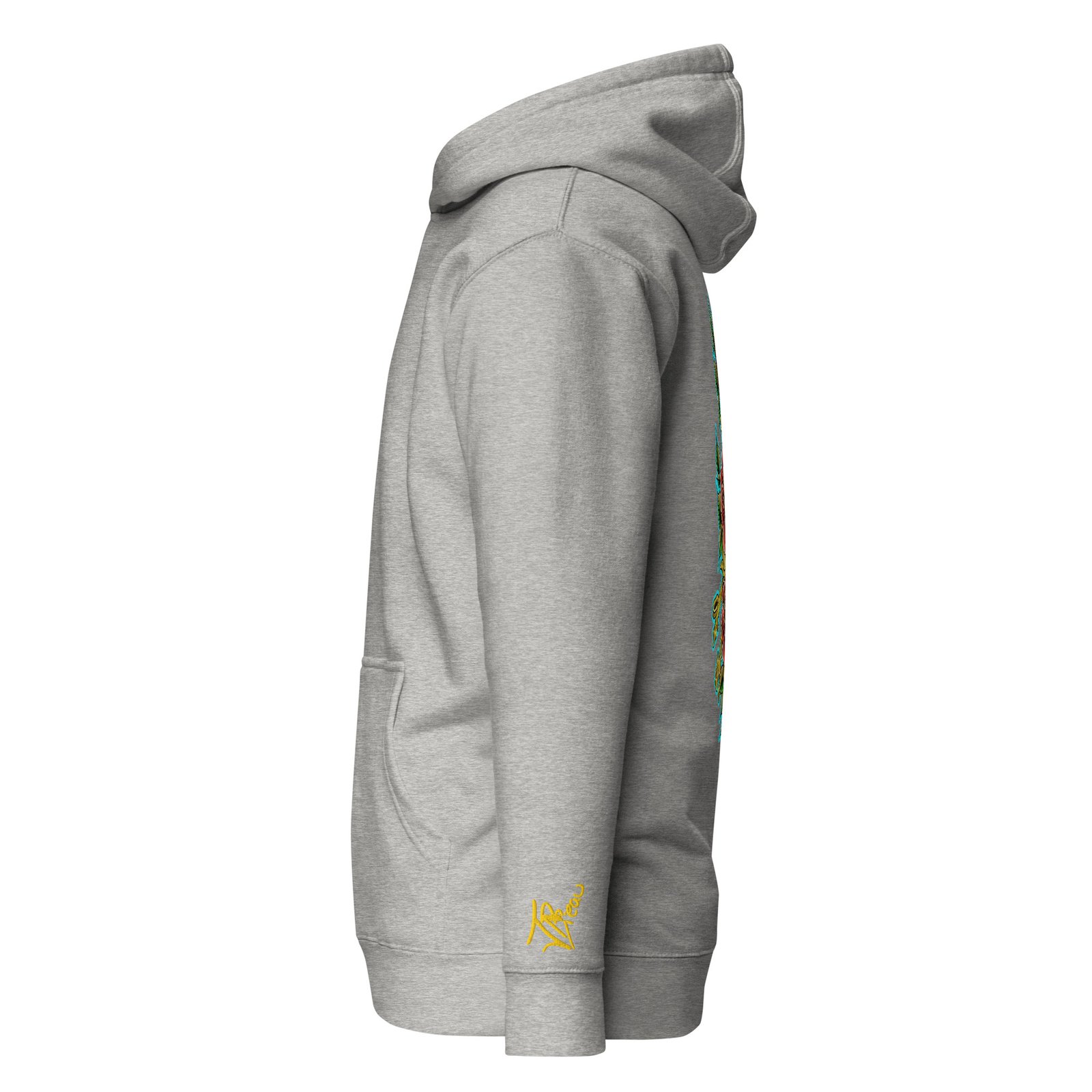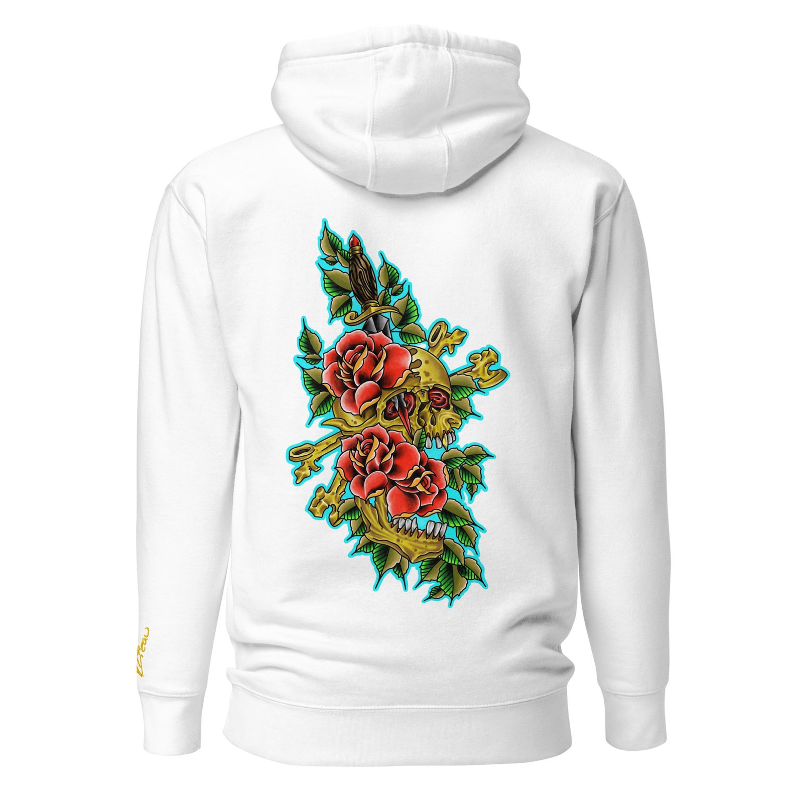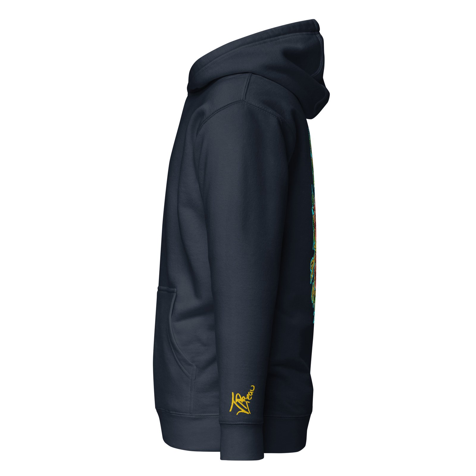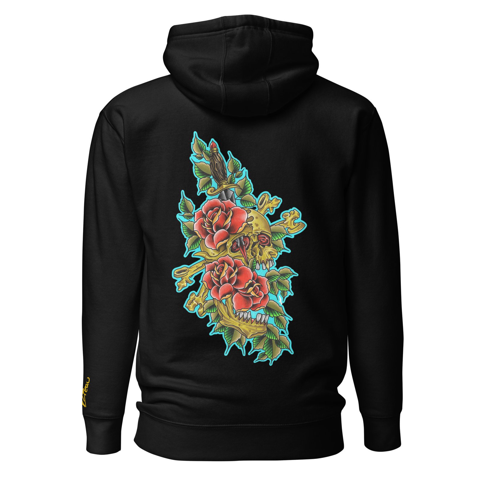 Ready to slay? Think high-quality cotton with a comfort-fitted hood, matching drawstrings, and a front pocket with a rocking art piece by Jason Breau of Ardent Ink Tattoo Studio Upgrade your look with this dope premium hoodie.